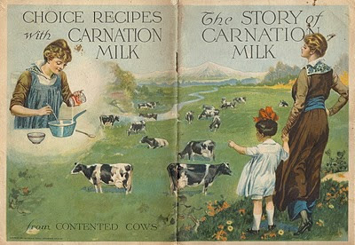 “The Story of Carnation Milk” was published in Seattle in 1915, a 32-page illustrated booklet of recipes prefaced by a paean to milk in general and to “condensed” milk in particular. The publisher was the Pacific Coast Condensed Milk Company, operator of fifteen Carnation condensaries, all located “far from city soot and manufacturing impurities, all located in the hearts of splendid milk producing sections, …literally ‘among the hills.’” Well, perhaps some of them were.