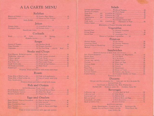 A salesman traveling through Grants Pass in the spring of1937 can eat very well at the Redwoods. While the beef comes from the Swift’s packing plant people, fresh seafood is offered, and both Eastern and Olympia oysters are listed (yes, more about those oysters later!). There is a grand effort to cast some Frenchified terms onto the menu, which proves difficult to do with a manual typewriter.