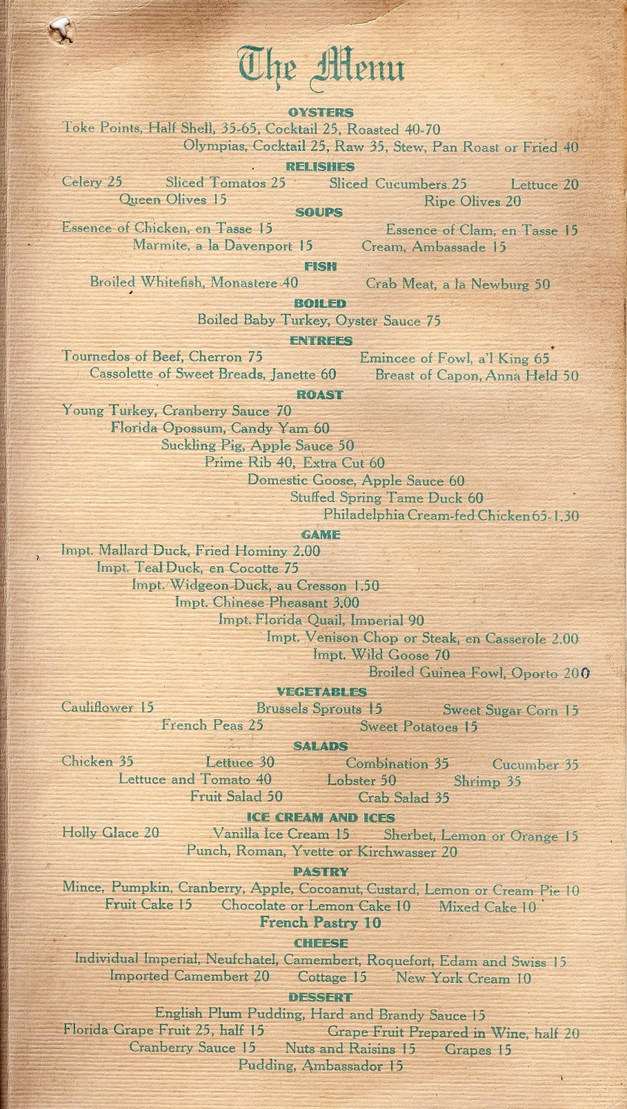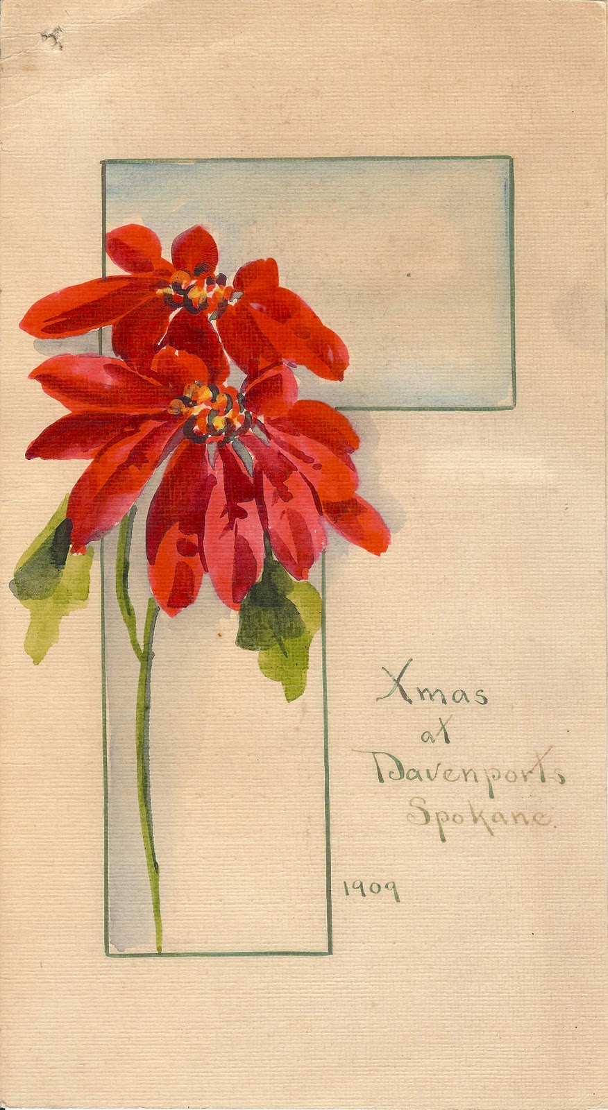 I recently acquired a menu from Davenport’s Restaurant, a special menu for Christmas of 1909: 101 years ago. The cover is a hand water color wash of poinsettia flowers, while the printed interior details the musical selections by Mr. Al. Thurston’s orchestra, as well as the menu. Dinner begins, of course, with oysters: Toke Points raw on the half shell, in an oyster cocktail, or roasted (from Willapa Bay’s north shore, probably raised from East Coast transplant seed), and the small, native Olympias, to be had raw, stewed, pan roasted, or fried (wild, from Puget Sound).