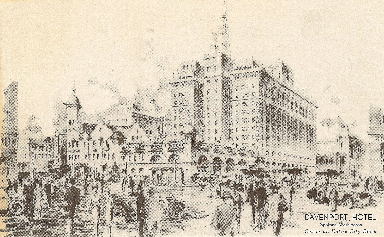 Louis Davenport (ca. 1869-1951) began operating a restaurant in Spokane in 1889, and it soon grew into a place of exotic decor and cosmopolitan dining pleasures. Davenport’s restaurant building in the early 1900s was an eclectic structure, sort of California Moorish Venetian, if you can envision such an amalgam. In 1914, Davenport added the management of a large hotel to his enterprises, which then comprised a city block; the architect of the hotel was Spokane’s noted Kirtland Cutter (he had also designed the restaurant; he was an exceedingly versatile designer).