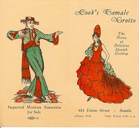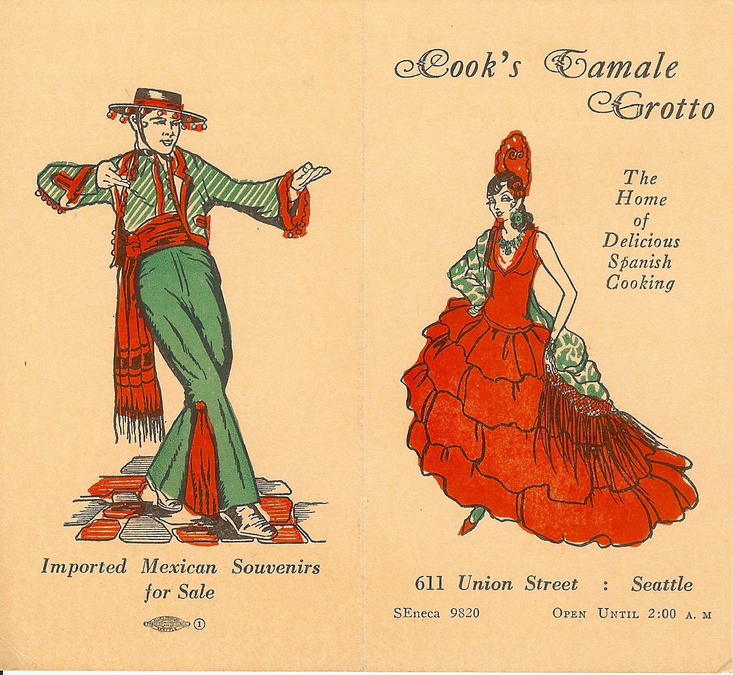 C. R. Cook came to Seattle about 1919, and with his wife Genevieve he soon opened Cook’s Tamale Grotto. Mr. Cook was born in Missiouri, and learned to cook in a chili parlor; later he traveled to Mexico. In the 1920s and 1930s his Seattle enterprise was a popular downtown lunch and dinner spot, with a menu that cheerfully ascribed Spanish, Mexican, Italian, Chinese, and even French, Texan, and Aztec attributes to its dishes. Fusion dining has deep roots.