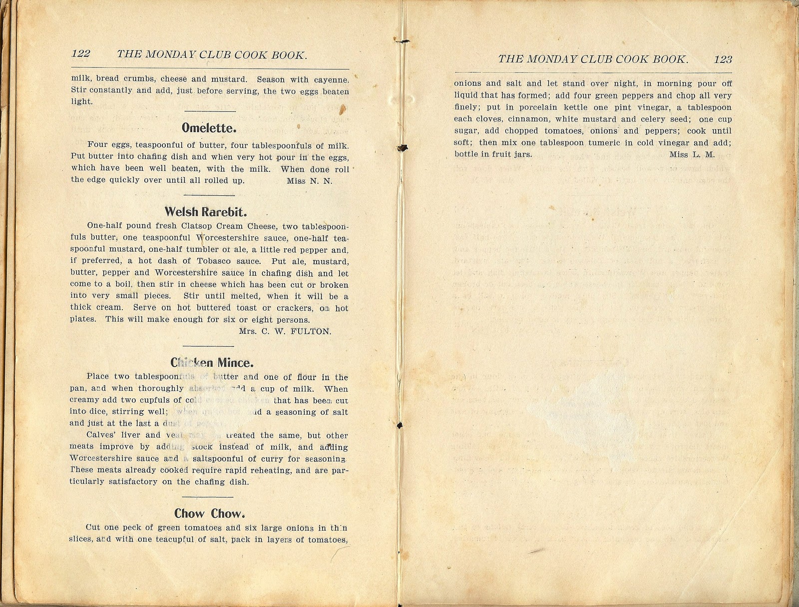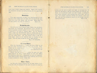 Here we have two recipes for Welsh rarebit, one peppery, the other slightly beery. The notable feature here is the specification of “Clatsop cream cheese” in both recipes. Such references in local cookbooks often indicate that the product is advertised in the book, but I did not find reference to it in any of the advertisements. “Cream cheese” here is not the Philadelphia kind, but a reference to a full-cream cheese, probably akin to a cheddar.