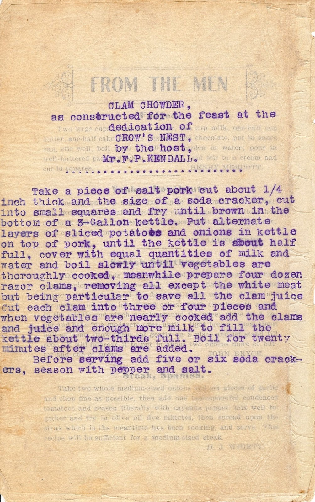 On the other hand, the carbon copy, typed, and tipped-in recipe by Mr. F. P. Kendall for clam chowder calls for fresh clams. Note that Mrs. Kendall adroitly inserted her husband’s recipe in the special section “From the men”; the heading shows through the thin copy paper of the insert.