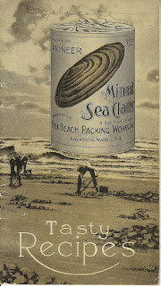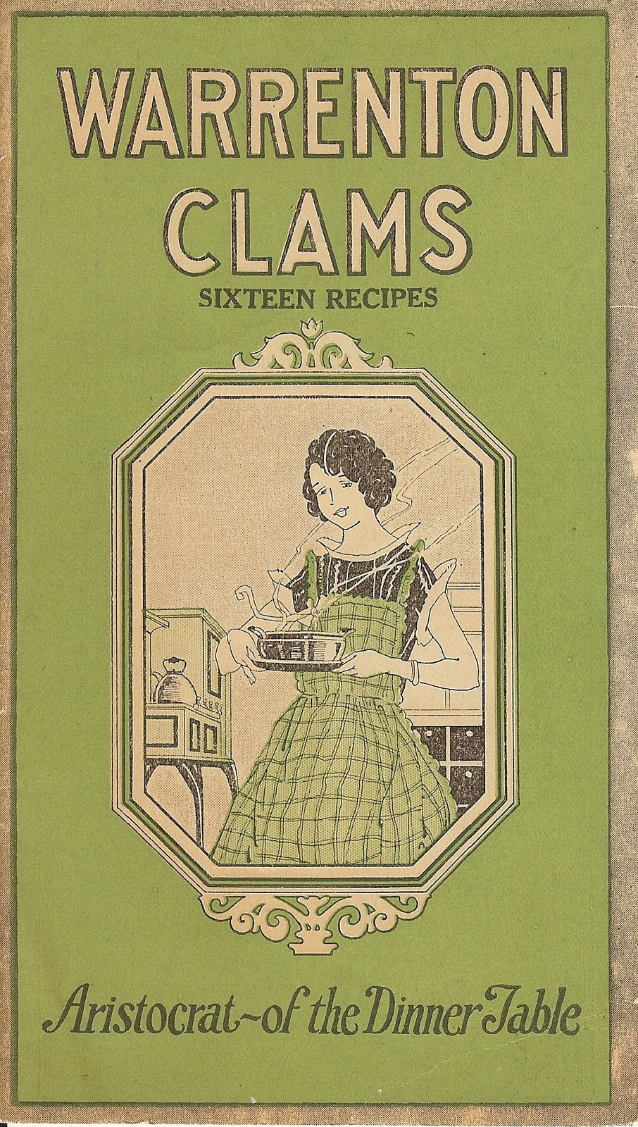 Another local product is canned clams; these are indeed specified in at least one recipe. And the cookbook includes an ad for Pioneer Brand minced sea clams, packed at Warrenton by the Sea Beach Pickling Works. Pictured here is a leaflet from the successor Sea Beach Packing Works, and another from the Warrenton Clam Company.