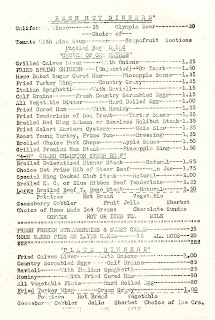 The sandwich menu (not shown) includes not only hamburgers and tuna fish sandwiches, but also salami, bologna, Denver, and St. Paul sandwiches. A Denver sandwich is related to a Denver omelette: onion, green pepper, ham, and scrambled egg between bread slices. But a St. Paul? Wikipedia expounds on an egg foo yung sandwich that is popular in St. Louis (yes, St. Louis), and also rather vaguely asserts that the term “has meant multiple things over the past sixty years”; “Originally, the St. Paul sandwich was known to contain four pieces of white bread with chicken and egg stuffed inside.” I shall have to peruse some old cookbooks, I can see.