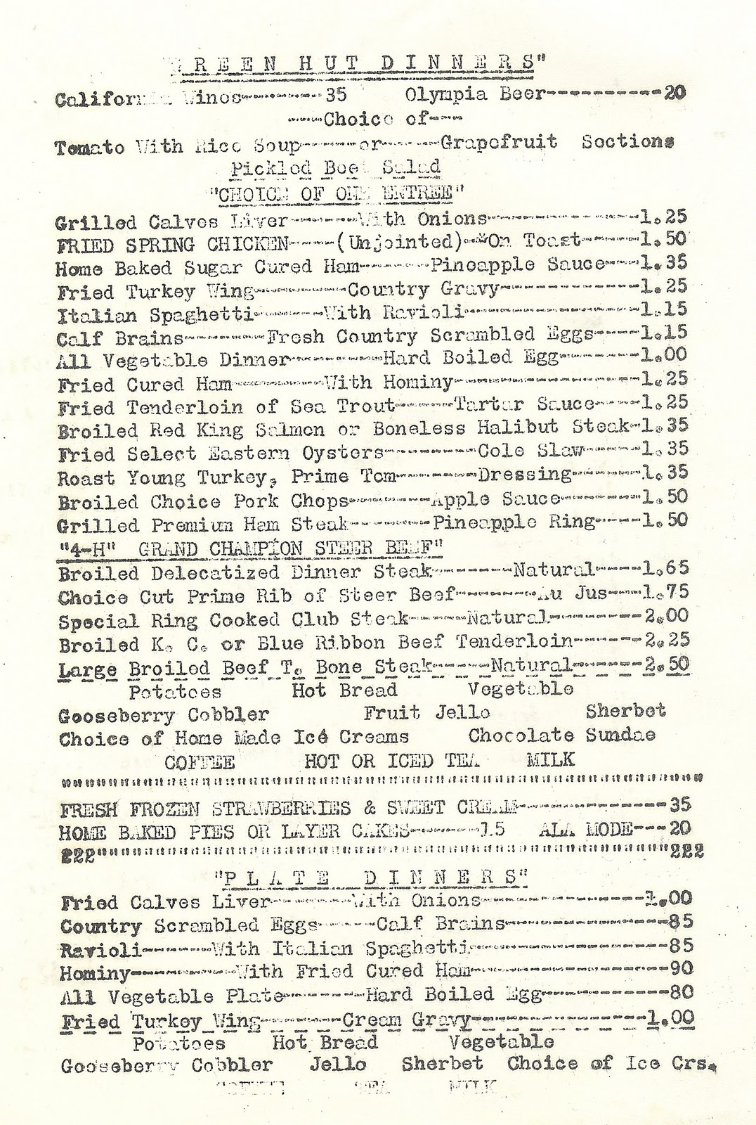 The cafe included a souvenir shop, and Grand Coulee souvenirs — postcard views especially — often feature the Green Hut. After the cafe’s demise, the Grand Coulee interpretive center was built on the former site of the Green Hut. This menu, which dates from about 1950, includes two carbon paper sheets of daily special items, one of which is shown here. Beef makes a strong showing, and the cafe had apparently recently purchased one of the county fair’s 4-H grand champion steers; this was once a common gesture by restaurants in agricultural areas. The menu’s wide-ranging variety of dishes suggests the wide-ranging employment draw of the Grand Coulee project: there’s ham and hominy, ham and pineapple, calf brains and liver, salmon and spaghetti, and gooseberry cobbler.
