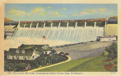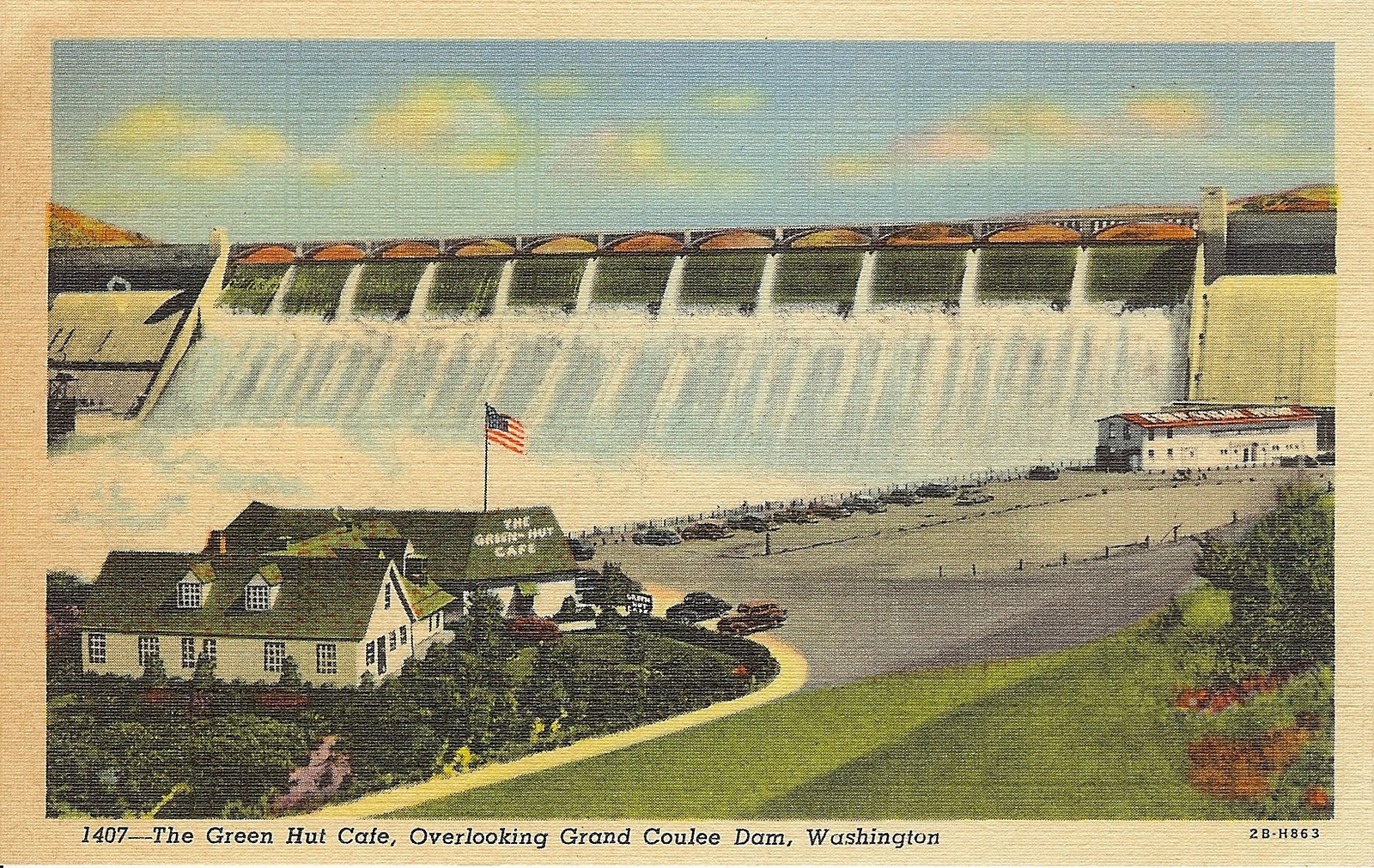 The Green Hut had one later incarnation, at another federal dam project. The Portland Oregonian on August 14, 1949 did a story on McNary City, which grew up around the construction of McNary Dam on the Columbia River. “The Green Hut Cafe, one of a string put up on damsites the Pacific Northwest by C. D. Newland, is McNary City’s only restaurant. Its three chefs put out meals from 5 a.m. till after midnight for practically everyone employed at the dam.”