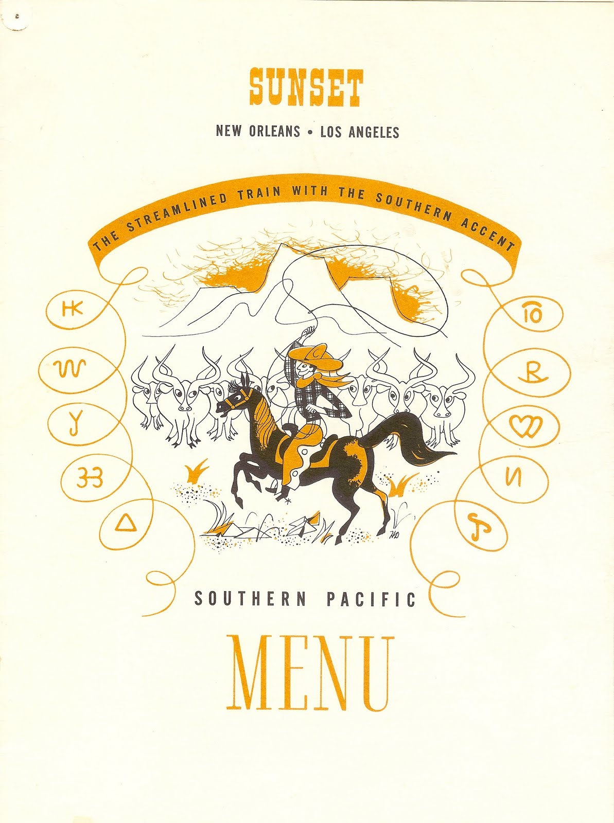 At its inception in the winter season of 1894 (back then, California was notably a winter resort), the Sunset Limited was a fancy-pants train that carried only first-class, Pullman sleeping car passengers on a once-a-week, winter-time schedule to San Francisco. By 1913, it operated every day, year-round; in 1950, it emerged as a snappy new streamlined train from Los Angeles to New Orleans, with both coaches and sleeping cars, a dining car decorated with Audubon prints (well, they were reproductions, of course), and a leathery lounge called “The Pride of Texas,” emblazoned with cattle brands.