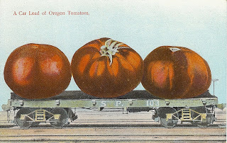 And sometimes they aimed for the Oregon postcard market. Oregon pears or apples or loganberries, sure, that would have made sense. But Oregon was in no position to boast of its magnificent tomatoes in, say, 1914. One wonders where the cards were sold, who bought them, who sent them (with ironic comments, of course)? My copy was never mailed.