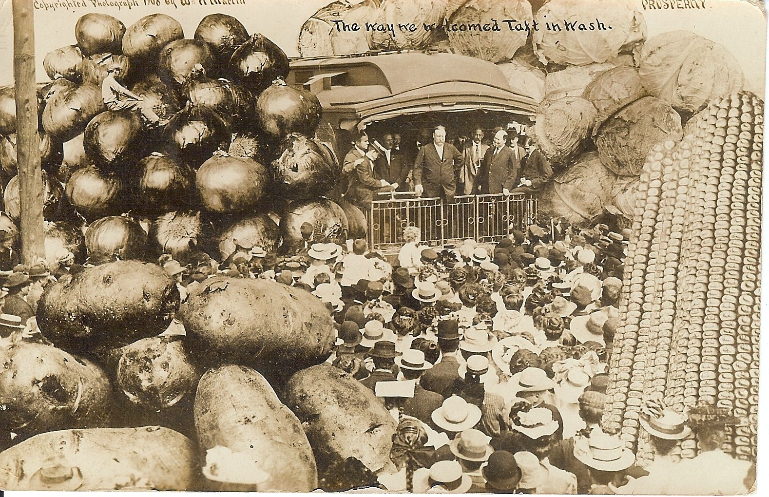 And then there are the famous real photo postcards produced by photographer William H. Martin of Ottawa, Kansas. Mr. Martin predates PhotoShop, but he produced composite images that rival those of modern technology. This is purportedly “the way we welcomed [presidential candidate William Howard] Taft in Washington” in 1908: with huge heaps of onions, ears of corn, potatoes, and cabbages. What a grand way to say Hello, vote for me!