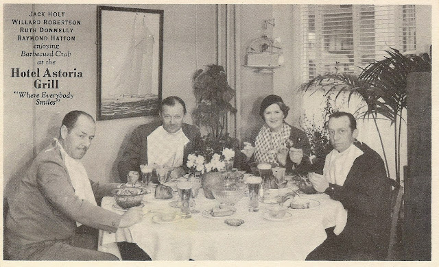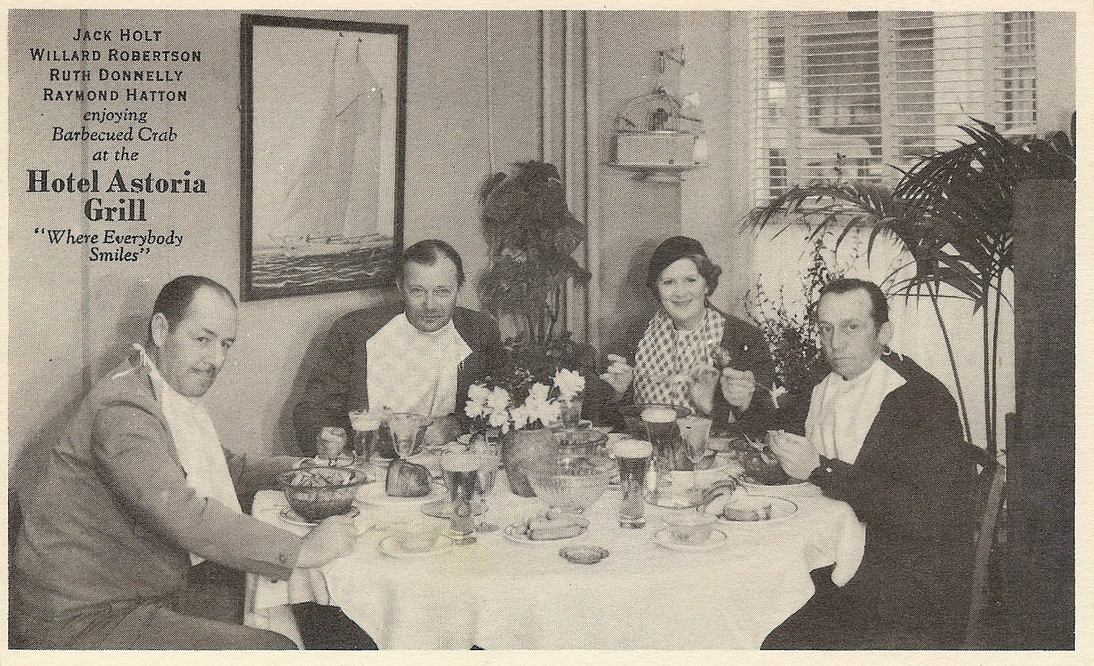 Introducing this squib is a printed postcard that shows some of the Roaring Timber cast rather doggedly consuming barbecued crab at the Hotel Astoria Grill. And perhaps you are wondering: how does one prepare, and eat, barbecued crab? Helen Evans Brown’s West Coast Cook Book (1952) indicates that this preparation “is a favorite in the Northwest, and rightly so, though I object to its being called ‘barbecued’”; she notes that “anything that has a spicy sauce dabbled on can now masquerade under that name,” and indeed that is what barbecued crab usually does (or did; you will rarely see it today). The crab is swathed in a sauce of catsup, fish stock, garlic, soy sauce, and curry powder, and (if not grilled) is poked into a casserole dish and hotted up, being basted with the sauce. Helen says the eaters thereof “should be well swathed in towels or wearing ribs”; our Hollywoodites have taken that advice to heart.
