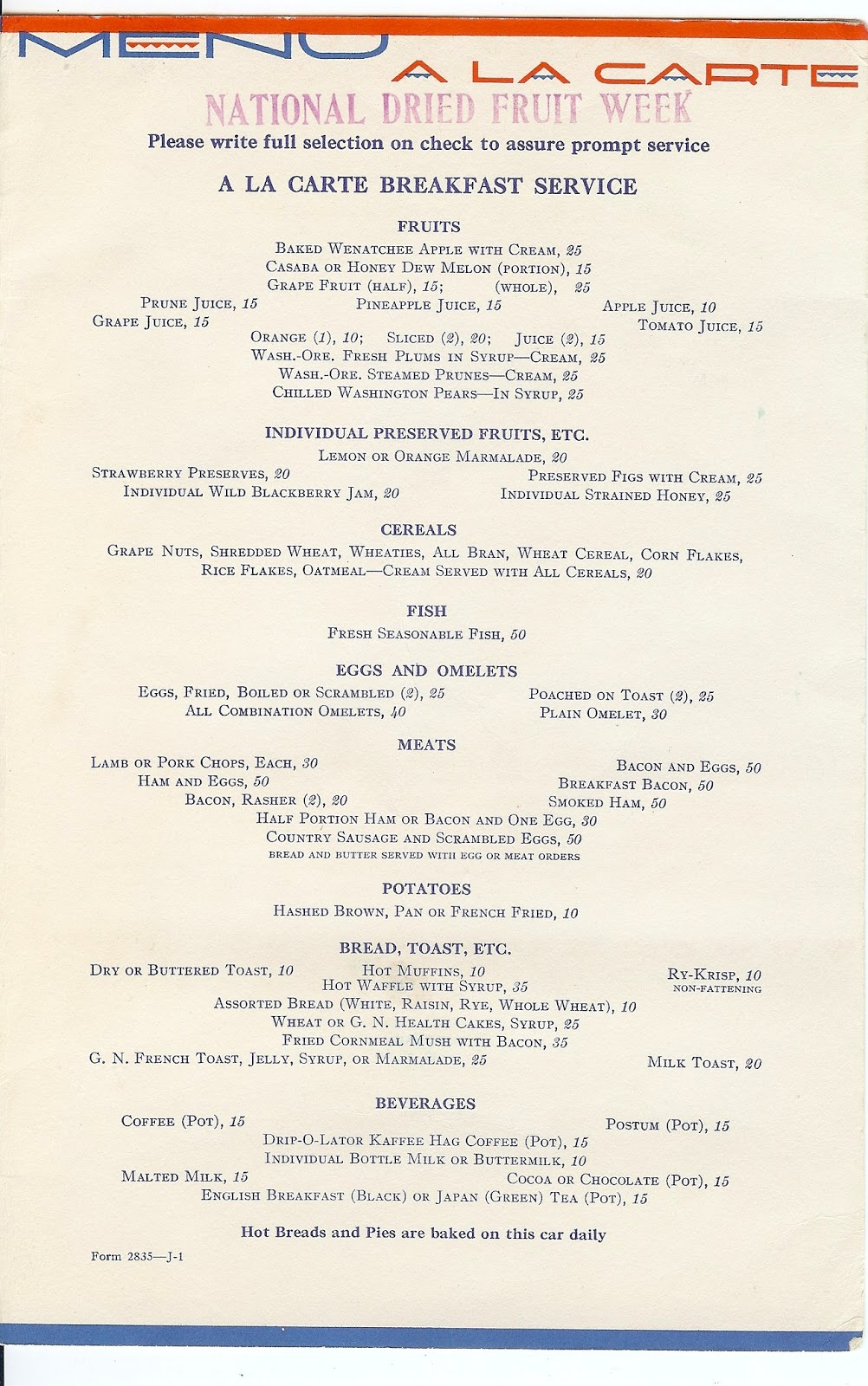 January is Prune Breakfast Month! You may well be aware that prunes have long held a reputation for keeping one’s tract moving along, and that prunes for breakfast were considered most helpful in giving the day a proper start. This breakfast menu from the 1930s, from a dining car of the Great Northern Railroad, features not only Pacific Northwest steamed prunes, but also the similarly laxative offerings of prune juice, fresh plums, and preserved figs!