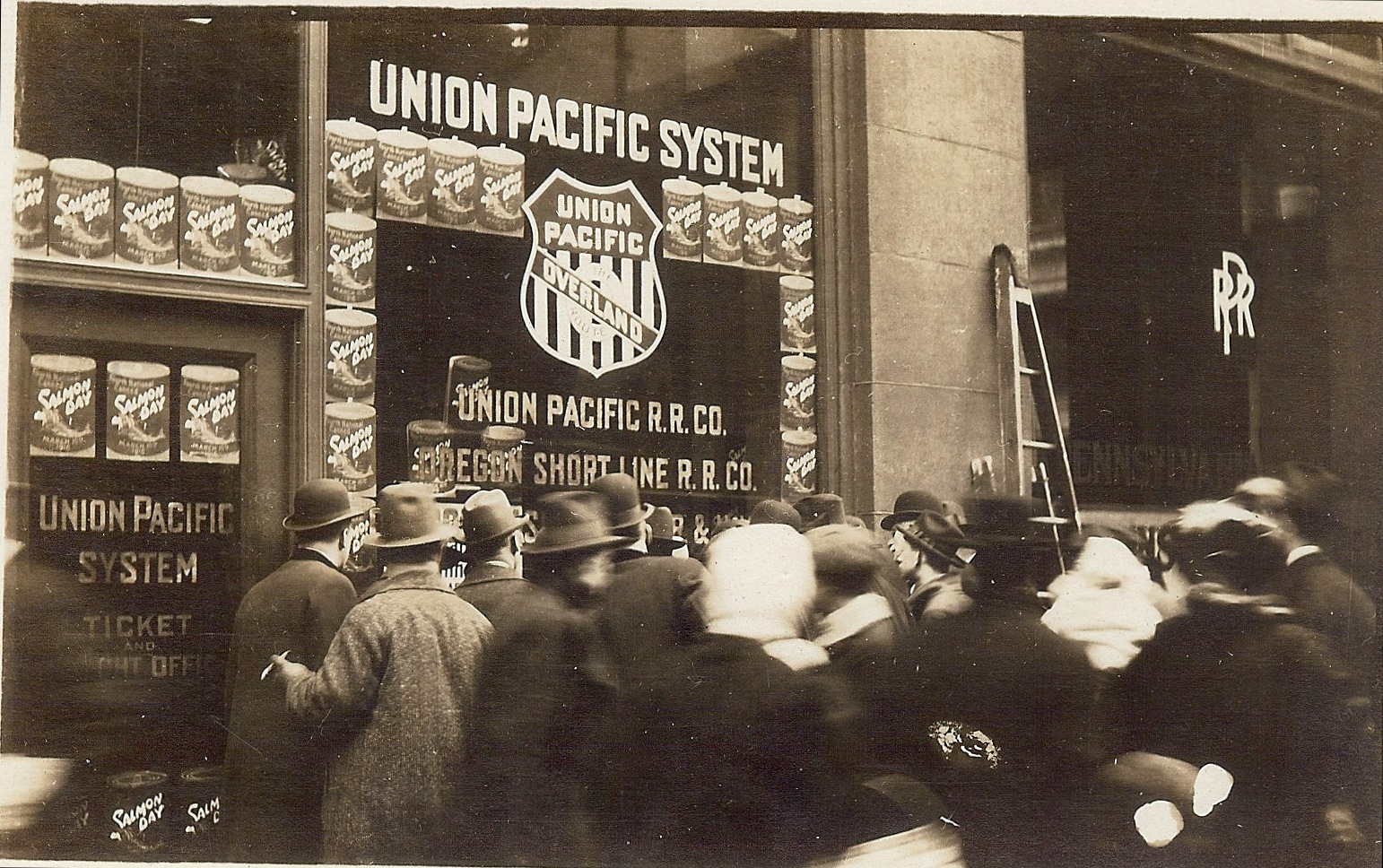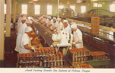 National Dried Fruit Week has passed from the calendar, and so has Salmon Day. This photo postcard was mailed to the Columbia River Packers Association (CRPA) in Astoria by J. Eleonfield, Pittsburgh general agent for the Union Pacific System, “The Salmon Route.” The typed message: “Crowd looking at Window Display, Union Pacific Railroad Office, Pittsburgh, Pa., account National Canned Salmon Day, March 10, 1916.” One of the CRPA brands was Bumble Bee; by the 1950s, Bumble Bee was better known for its tuna than its salmon.