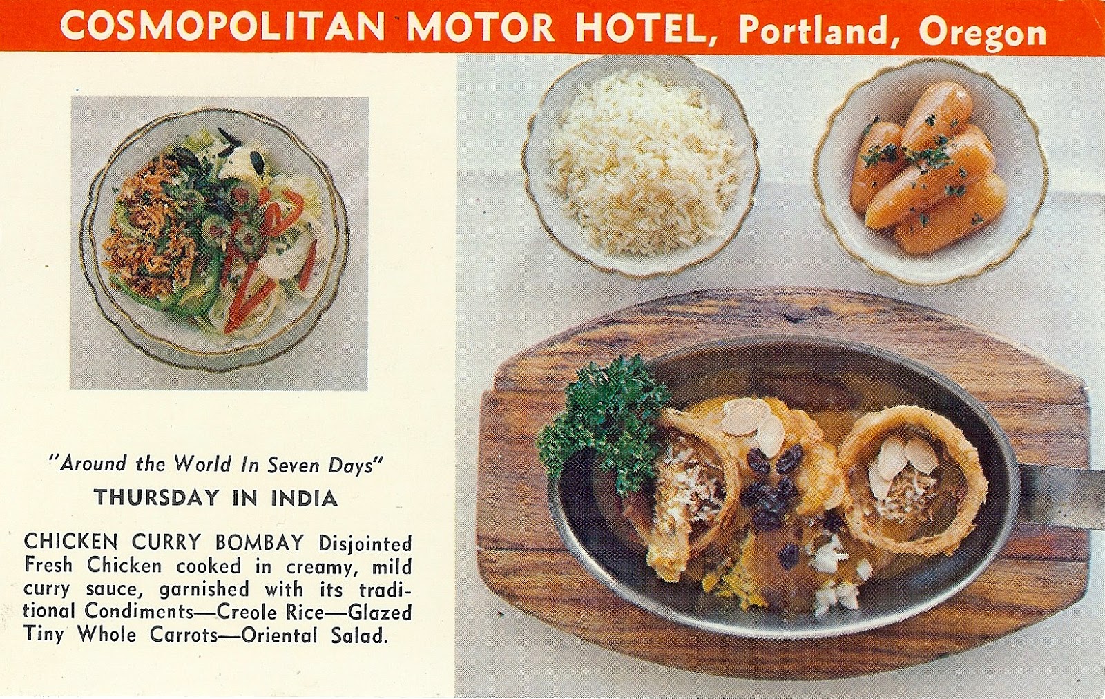 By 1964, Herzog and the Cosmo were advertising a menu that went “Around the World in Seven Days.” While the Top of the Cosmo may not have made much of a difference in advancing Portland’s cosmopolitan credentials, over time Herzog did make an impact. He was one of the first members of the Chefs de Cuisine Society of Oregon, and he went on to head his own restaurant, the Swiss-themed Matterhorn in the early 1970s. The Cosmopolitan Motor Hotel is today the Red Lion Convention Center, and the Top of the Cosmo is called Windows Skyroom and Lounge. It appears that what goes on there today is almost entirely pre-sports-event drinking–no longer is it a place to go for some adventuresome, cosmopolitan dining. Fortunately, now there are many other options for culinary explorations.