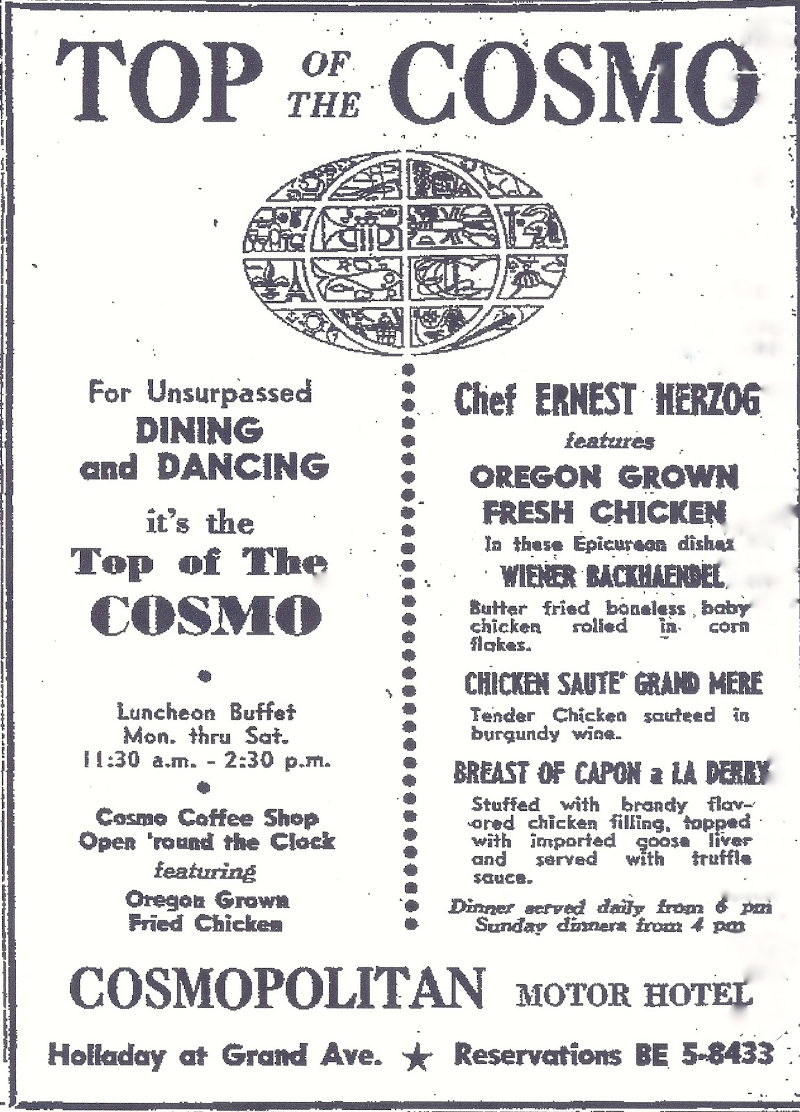 In December 1962, the Cosmopolitan Motor Hotel opened at the corner of NE Grand Avenue and Holladay Street, plonked sort of halfway between the new Lloyd Center shopping mall and the new Veterans Memorial Coliseum. Though only a modest five floors in height, it boasted a rooftop dining room touted as “Top of the Cosmo,” headed by a Swiss-born chef, Ernest Herzog. Herzog had experience in Puerto Rico and at the Portland Sheraton (another new hotel, located at Lloyd Center) before coming to the Cosmo, where his menus featured “Oregon grown fresh chicken” in 1963.