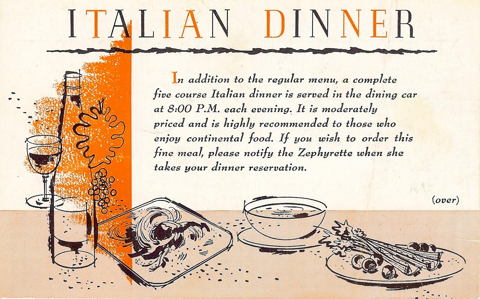While French cuisine apparently did not last very long, we have here a 1939 menu from the streamliner City of Los Angeles, showing a few variations on the theme. Railroad dining cars had a habit of occasionally promoting regional products on their menus, or of pushing particular foods, but to offer an entire “ethnic” menu was pretty rare. The only other one that springs to mind (it, too, did not last for long) was the “Italian Dinner” served on the California Zephyr in the 1950s, between Chicago and San Franciso. Don’t you think a Thai menu would have a following on the Amtrak Cascades trains to Seattle?