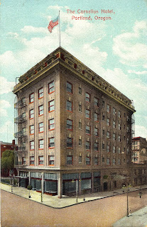 A few years ago when I was on the Portland Historic Landmarks Commission, a long-hoped-for proposal came to us, to renovate the Cornelius, a downtown hostelry on Park Avenue that had long been vacant and neglected. The Cornelius has something of a mansard roof, and huge, heavy, openable double-hung windows, and is located right in the heart of things at the corner of Park and Alder. Designed by John V. Bennes, it was built in 1907-1908. It’s a handsome structure, very dignified, nicely detailed. A small Europeanish remnant of the Portland a century ago, but one that still fits comfortably into its corner of town.