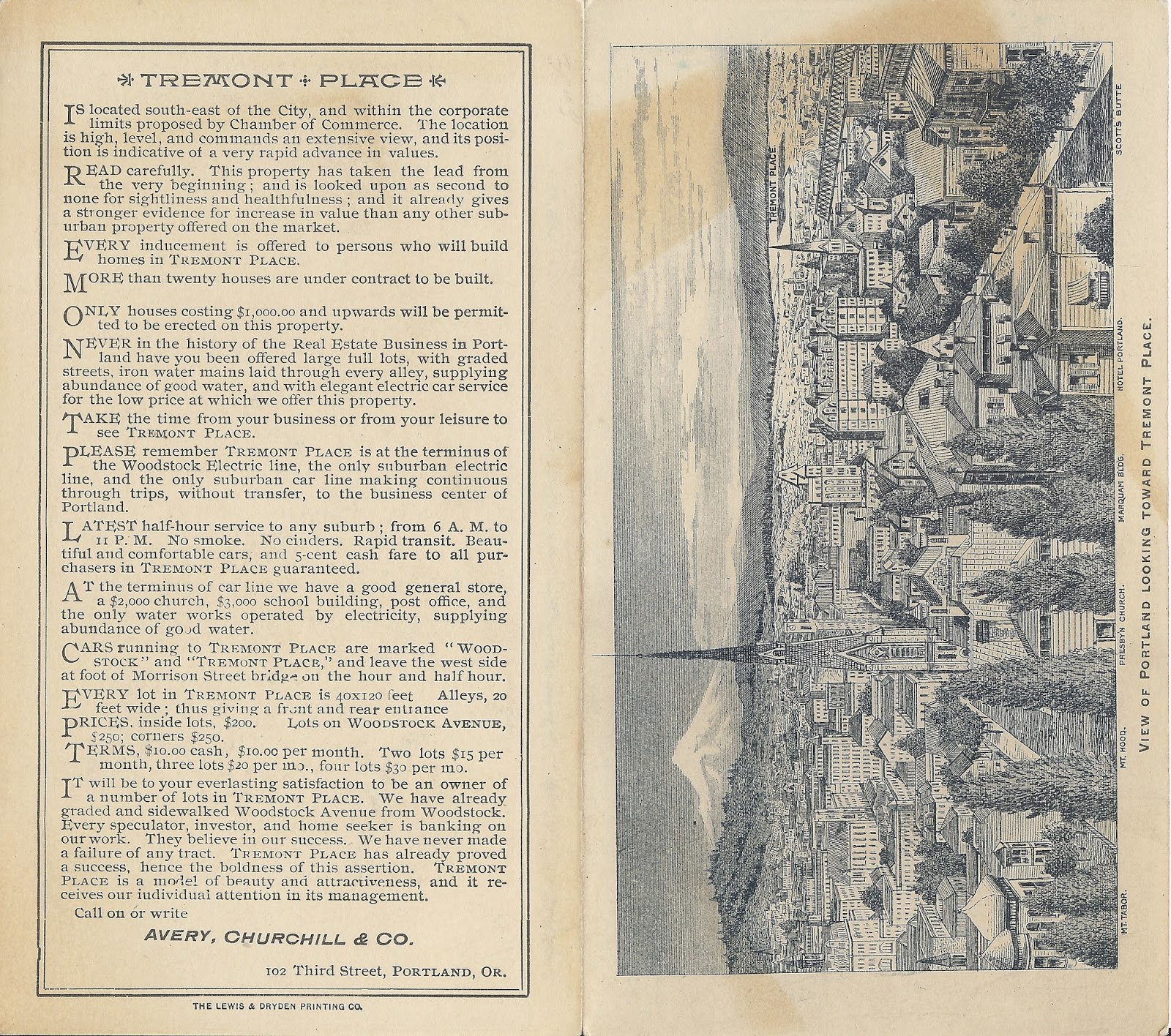 Here we have some advertising for the first of a trio of plats: Tremont Place (1891), which was followed in 1892 by Tremont and Tremont Park. All three were situated just beyond the end of the rickety Waverly Woodstock electric streetcar line, which after many tribulations began operating in 1891 over the new Madison Street bridge to what is now SE 41st Avenue and Woodstock Boulevard; it eventually extended into the Tremont tracts as far as SE 57th. A post office was established as Tremont in 1892.