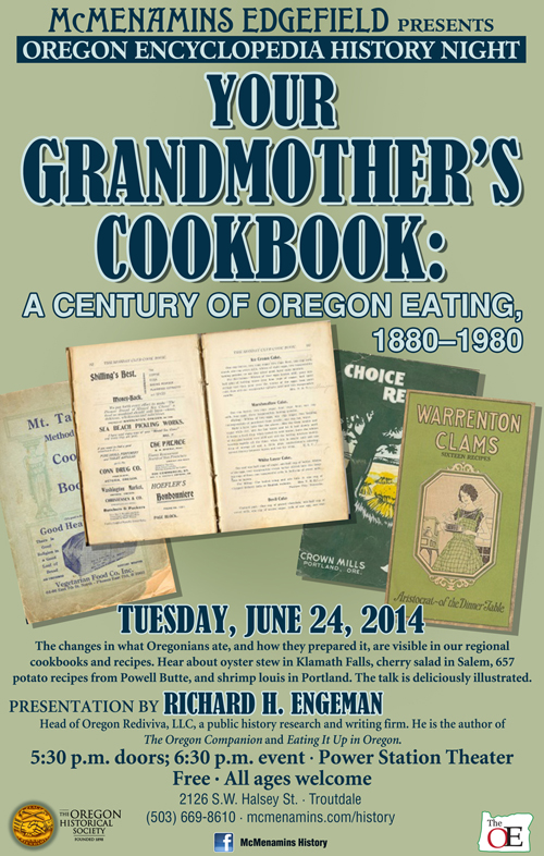 The changes in what Oregonians ate, and how they prepared it, are visible in our regional cookbooks and recipes. At this OE History Night hear about oyster stew in Klamath Falls, cherry salad in Salem, 657 potato recipes from Powell Butte, and crab Louis in Portland.