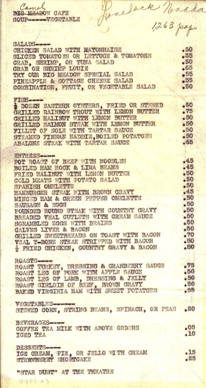 Tipped into the menu when I acquired it was a loose sheet of daily specials, a typed listing on carbon paper. In comparison with the White Restaurant menu, it is quite ambitious. At the top, it says BIG MEADOW CAFÉ, crossed out and replaced with Camel; also, the notation Lovelock, Nevada, 1,263 pop. At the bottom is the suggestion, “’STAR DUST’ AT THE THEATRE.” So what’s that all about?