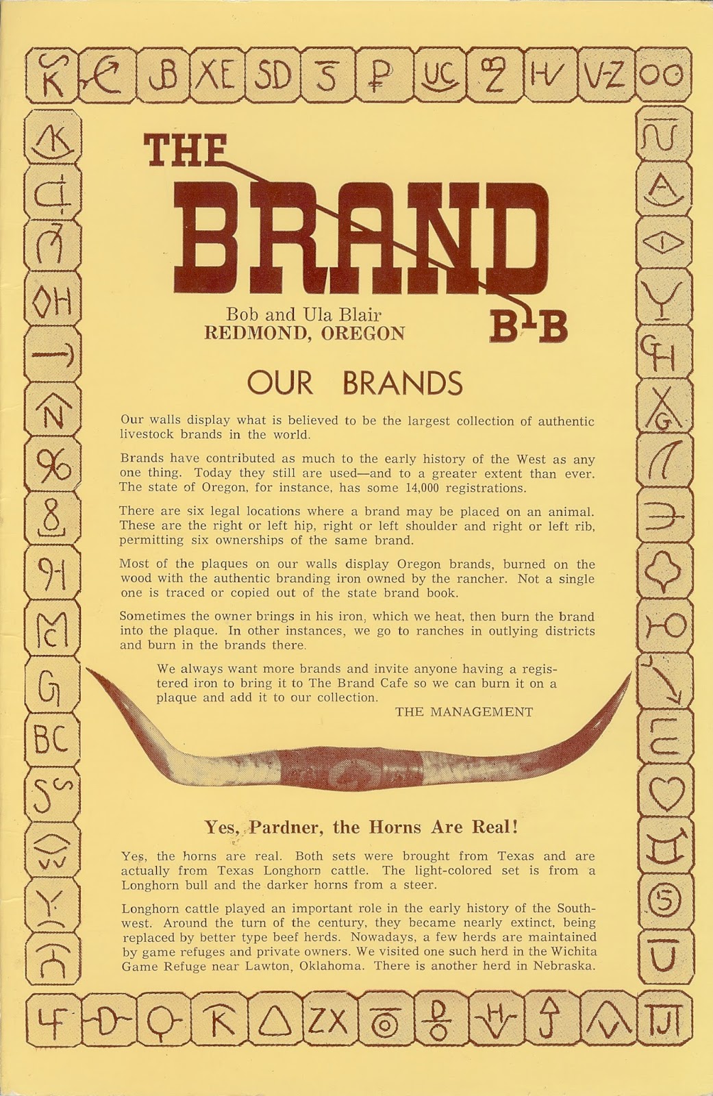 As the postcard above shows, the Brand’s décor was spartan, but with a distinctive flair. The name reflects the motif, which featured “what is believed to be the largest collection of authentic livestock brands in the world.” Two sets of Texas longhorn cattle horns punctuated the wall of brands. The girls have been sitting below the horns for nearly an hour now, drinking Folger’s ….