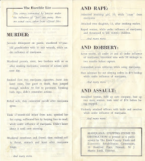 “The Truth about Marijuana: Stepping Stone to Destruction” was issued in 1967, by the Essex County Youth and Economic Rehabilitation Commission in Newark, NewJersey. My copy? It came into my hands when I was a student at Reed College in Portland, Oregon, probably in 1968. Apparently the pamphlet was distributed in some half-million copies in 31 states, according to a letter written by Martin Lordi of the ECYERC and published in the June1968 issue of Playboy.