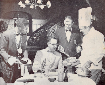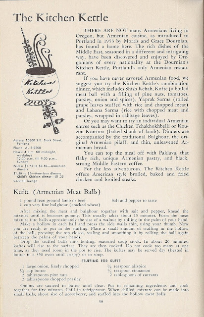 The booklet was issued in 1959. That was the centennial year of Oregon’s statehood, an anniversary that launched many projects that catered to visitors, and to Oregonians who were exploring their state. Thirty of the restaurants are in Portland; others are in Yachats, Eugene (2), Cannon Beach Junction, present-day Lincoln City (2), Salem (2), Central Point, Multnomah Falls, and Timberline Lodge. The reviews were based on a series of longer articles that appeared in the Oregonian in 1958 and 1959.