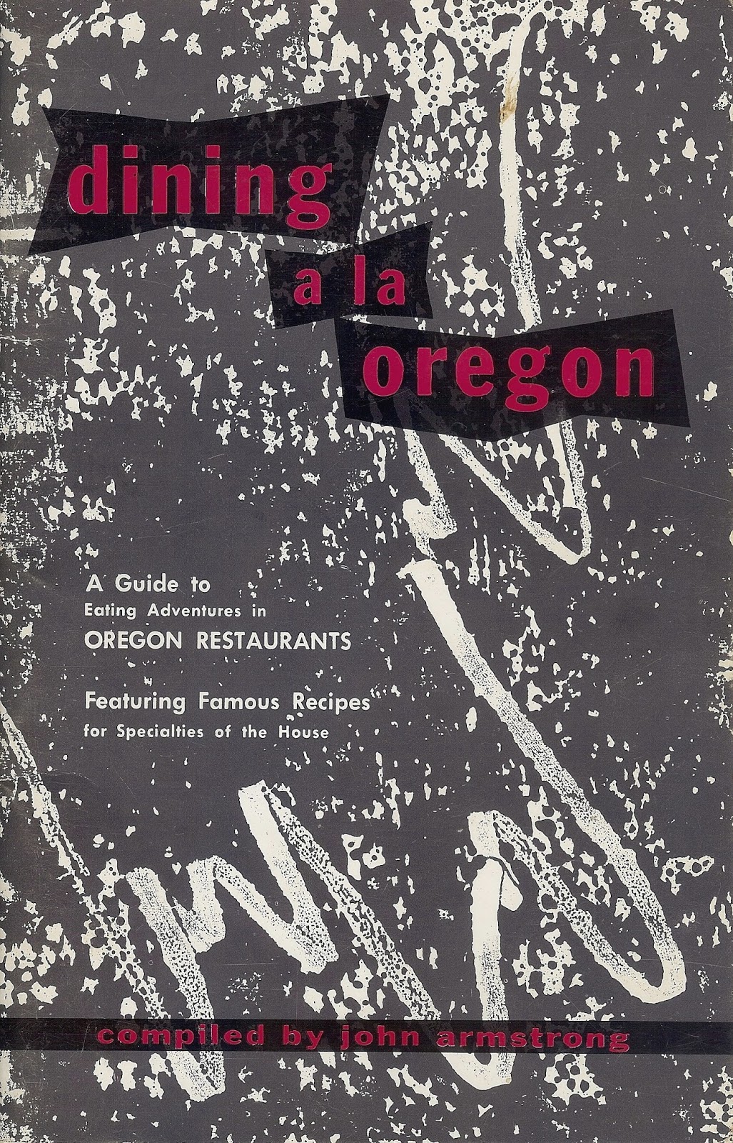Dining a la Oregon: A Guide to Eating Adventures in Oregon Restaurants, Featuring Famous Recipes for Specialties of the House appears to have been the first compendium of what might be called reviews of Oregon restaurants. It was “compiled” by John A. Armstrong, a “Sunday and feature editor” for the Portland Oregonian newspaper and an honorary member of the new Chefs de Cuisine Society of Oregon. Dining a la Oregon* reviews some 41 Oregon restaurants.